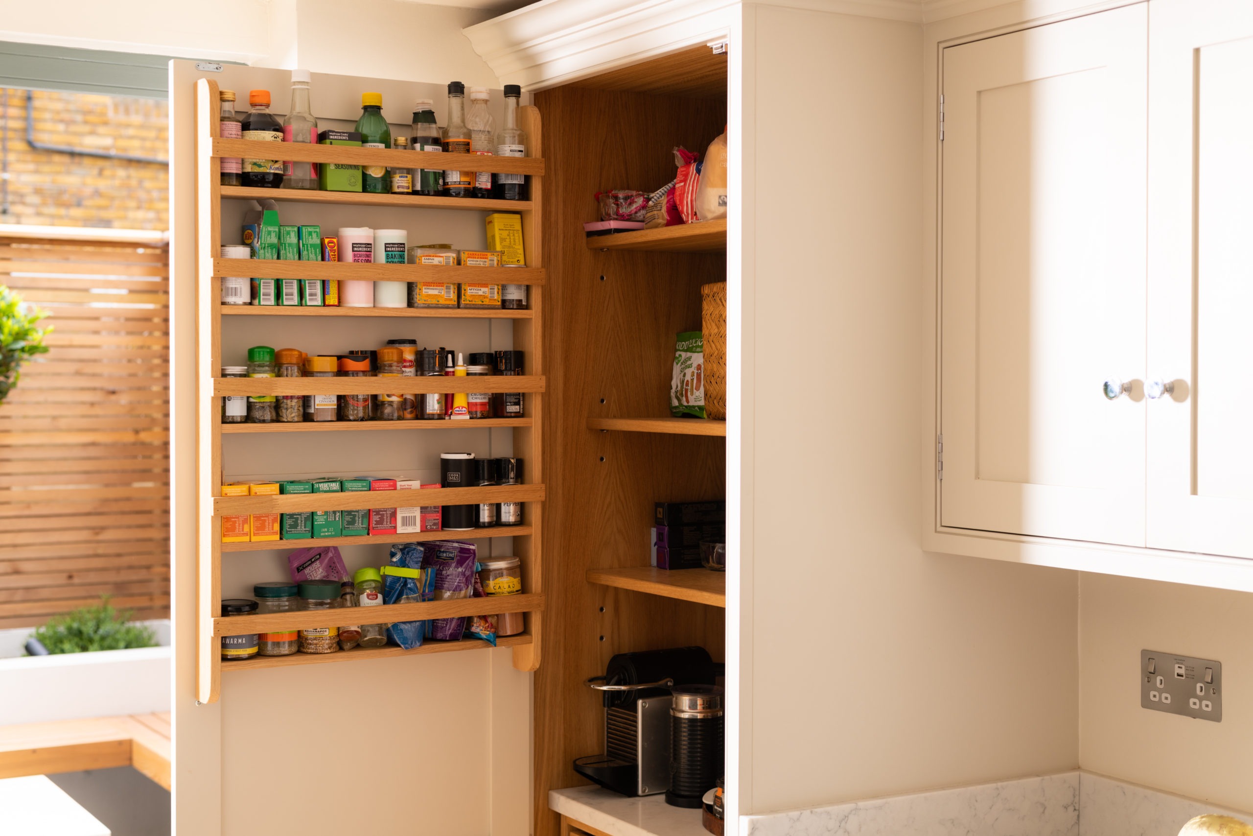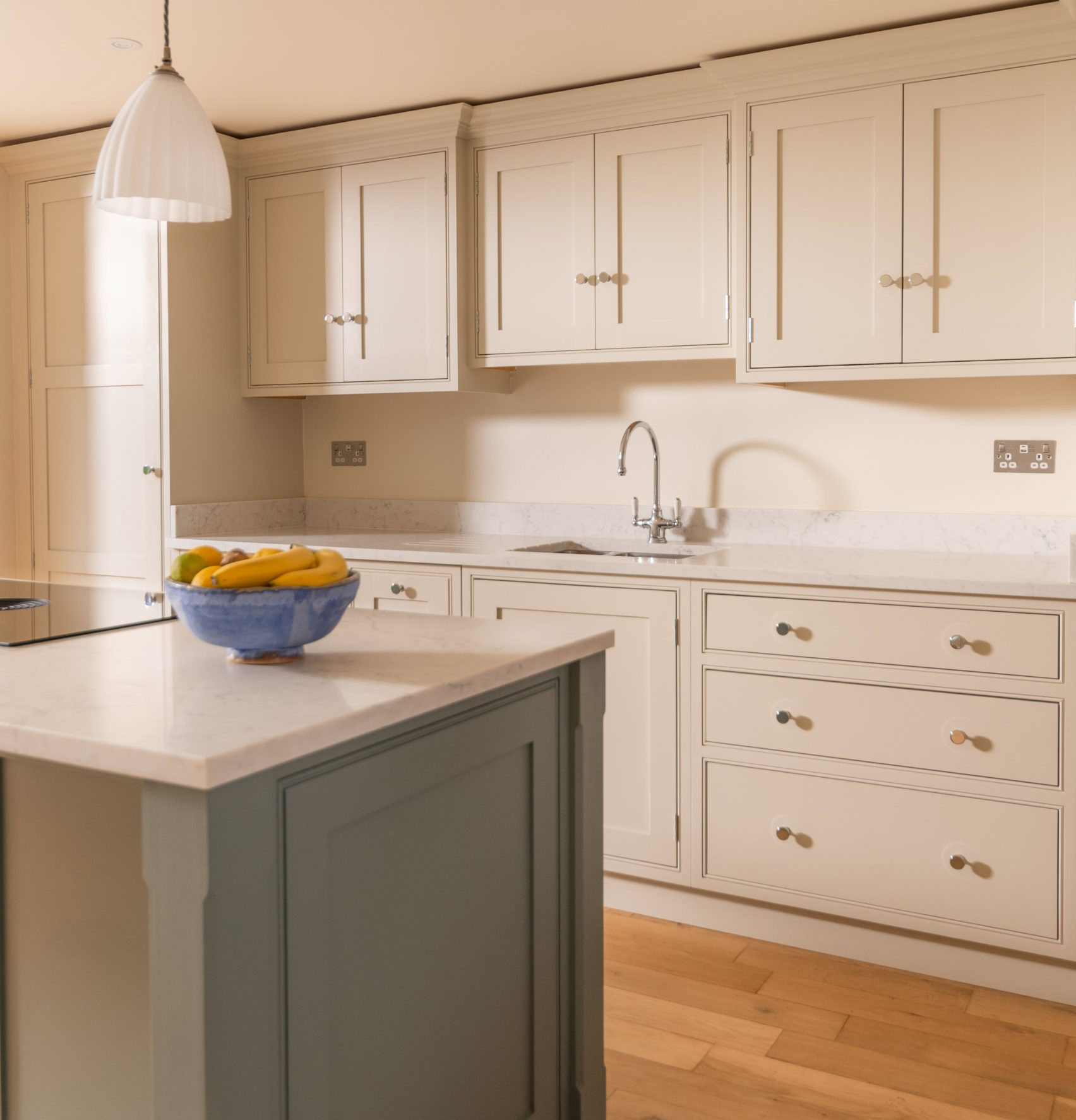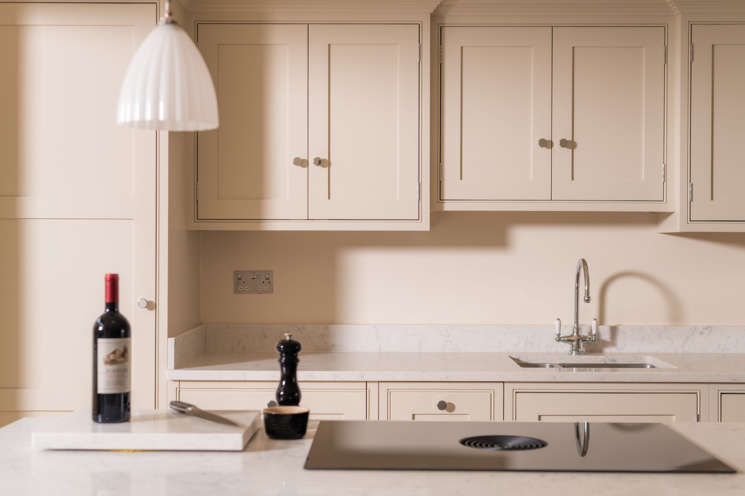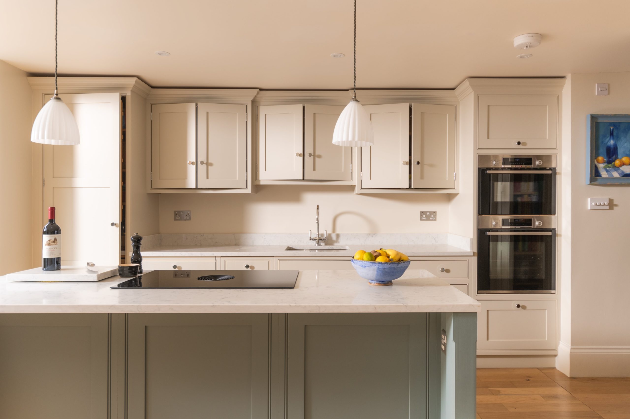 The induction hob and integrated extractor creates a peace of mind cooking experience the space above the island remains free and open promoting cooking creation in the centre of the kitchen. The subtle two tones define individual style complimenting the balanced space that is ideal for the family.